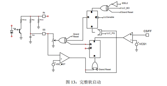 •在軟啟動(dòng)或重啟時(shí),專用引腳將SS電容放電至地,從而提供平順的輸出電壓上升;在LLC被CS/FF引腳(>1V)或BO功能關(guān)閉時(shí),SS引腳給CSS放電,并提供純粹的軟啟動(dòng);