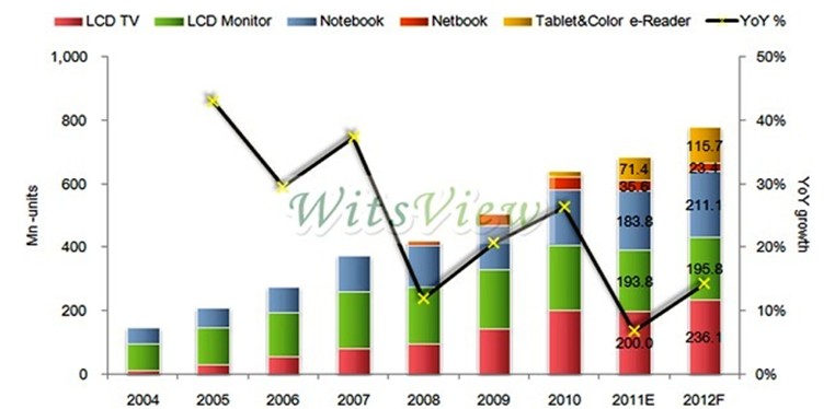 在low cost direct type LED TV、 3D TV 、super narrow bezel、 LED Monitor 、ultra slim module、high resolutiON、new TV sizes、high transmittance panel、 Windows 8 等新產(chǎn)品及新作業(yè)系統(tǒng)的帶動(dòng)下,WitsView對(duì)于2012年大尺寸面板的需求抱持著審慎而樂(lè)觀的看法,預(yù)估年成長(zhǎng)率將達(dá)12~14%,面板總量上看7億8,000萬(wàn)片,其中平板電腦及彩色閱讀器面板的年成長(zhǎng)率仍將超過(guò)60%,達(dá)1億1,500萬(wàn)片。