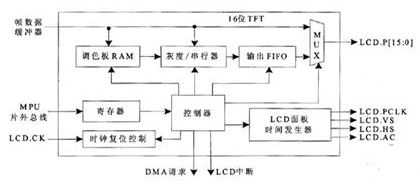LCD控制模塊的數(shù)據(jù)通道由調(diào)色板RAM、灰度/串行器和輸出FIFO這3個部分組成。這3個部分支持12或16位STN方式,由控制器控制輸出數(shù)據(jù)到LCD的數(shù)據(jù)總線上。而對于16位薄膜工藝學(TFT,Thin ̄Film Technology)方式,數(shù)據(jù)直接傳輸?shù)絃CD的總線,提供2(16)=64K的彩色信號。