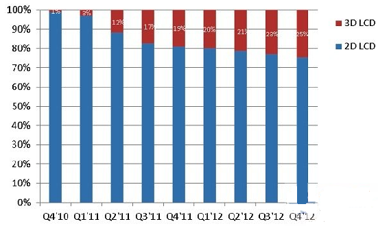 根據(jù)NPD DisplaySearch的調(diào)查,在元旦期間的主要城市賣場,3D液晶電視在零售終端滲透率甚至高達(dá)40%;而整體3D液晶電視出貨滲透率可望在2012年第一季超過20%;該機(jī)構(gòu)在全球電視出貨與預(yù)測季報(bào)(Quarterly Advanced Global TV Shipment and Forecast Report)中預(yù)測,到2012年第四季,中國大陸 3D液晶電視滲透率可達(dá)25%。
