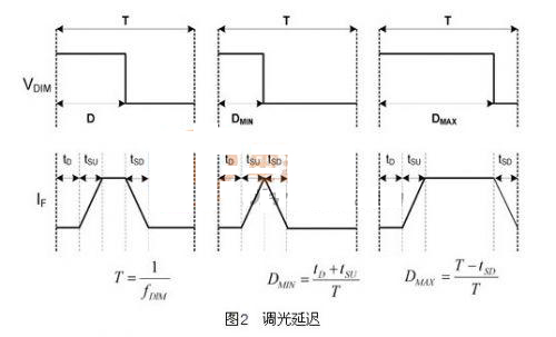 對于PWM調(diào)光訊號而言,每個LED都有限定的響應(yīng)時間,圖2表示三種不同的延遲,延遲愈大者表示能達(dá)到的對比度就愈低(對光強度控制的一種測量方法)。