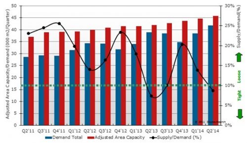 由于面板廠商在過去六個(gè)季度連續(xù)虧損,且產(chǎn)業(yè)處于不景氣階段且仍將維持一段時(shí)間,面板廠商凍結(jié)了所有液晶電視產(chǎn)線的擴(kuò)張計(jì)劃。與此同時(shí),面板價(jià)格下降,增加了市場(chǎng)需求,尤其是50寸及以上的大尺寸電視面板。因此NPD DisplaySearch預(yù)測(cè)特別是在2013年,面板供需平衡將較為緊張,供需過剩比將自2010年第二季度以來首度下降到10%以下。由此,NPD DisplaySearch預(yù)計(jì)平板產(chǎn)業(yè)將開始新的循環(huán)周期,面板價(jià)格將逐步上升,利潤(rùn)得以提高,并促使投資增加。