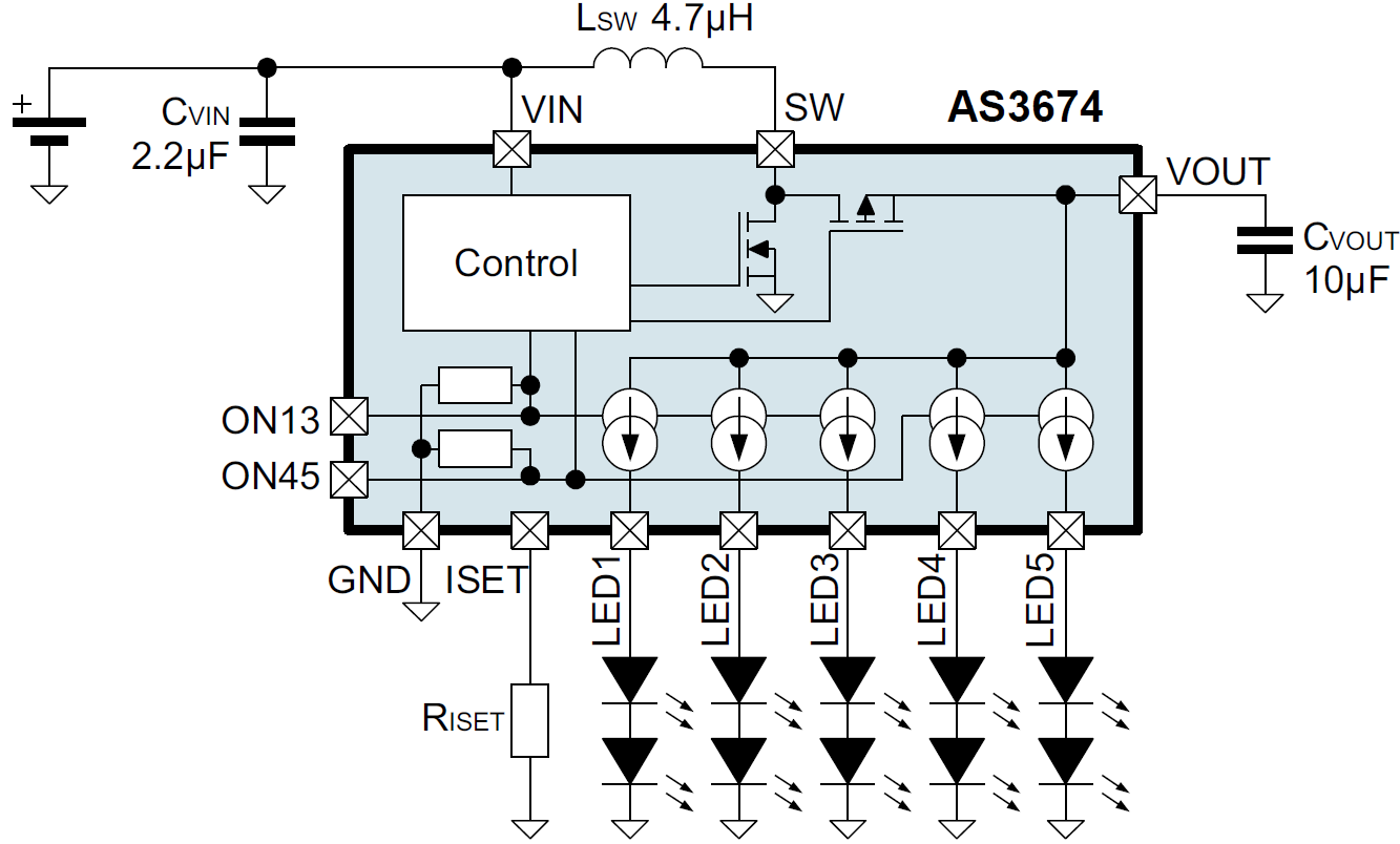 AS3674背光燈驅(qū)動(dòng)芯片家族補(bǔ)充了奧地利微電子照明管理單元的產(chǎn)品組合,單個(gè)的芯片就綜合了背光燈、智能燈光、環(huán)境光傳感器(ALS)等應(yīng)用處理性能。AS3674是一款高效的2 Mhz DC-DC開(kāi)關(guān)式升壓轉(zhuǎn)換器,可控制5組電流源,每組各驅(qū)動(dòng)2個(gè)串聯(lián)的LED。其新增的靈活性體現(xiàn)在控制LED的電流時(shí)可由外部電阻器設(shè)定,單通道最高可達(dá)25 mA。AS3490與AS3674具有同樣功能,但僅包含三組LED通道。