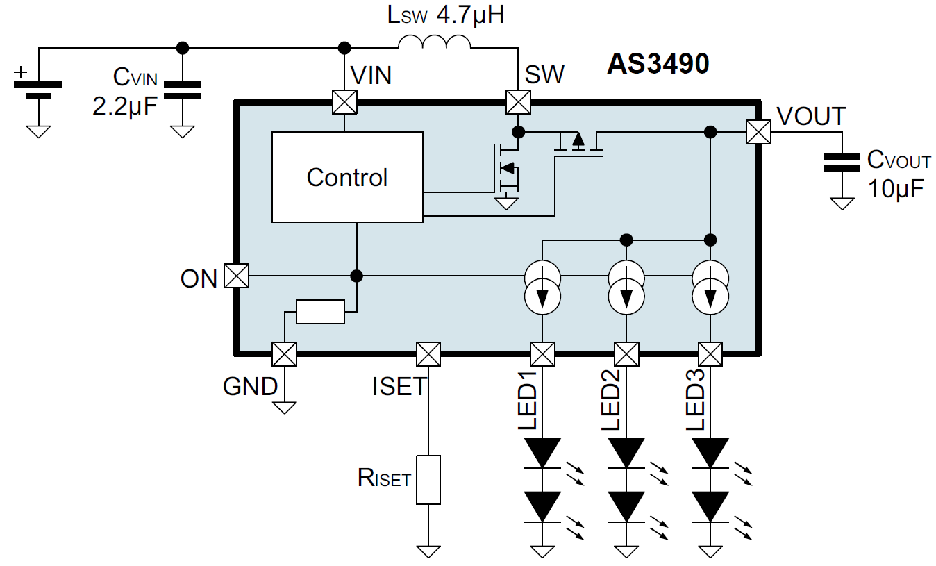 軟啟動(dòng)的特點(diǎn)使AS3674更容易集成到對(duì)噪音敏感的無(wú)線(xiàn)射頻系統(tǒng)中。AS3674由兩組輸入電路控制,也可用介于100-800赫茲的PWM電路控制,實(shí)現(xiàn)1:2000的調(diào)光比。單通道兩個(gè)LED的配置結(jié)合2 MHz的轉(zhuǎn)換器操作頻率,實(shí)現(xiàn)使用諸如4.7µH電感的微小外部組件并取得優(yōu)于競(jìng)爭(zhēng)對(duì)手最高達(dá)6%的高效率。