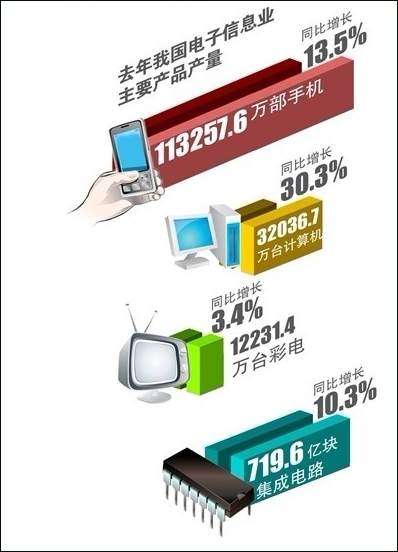 近日,工信部發(fā)布《2011年電子信息產(chǎn)業(yè)統(tǒng)計公報》,在2011年,我國彩電、手機、計算機等主要電子產(chǎn)品產(chǎn)量占全球出貨量的比重分別達到48.8%、70.6%和90.6%,均名列世界第一。