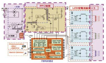 針對照明市場的這些需求,瑞薩電子的78K0/Ix2 MCU產品,很好地解決了這些問題。78K0/Ix2相應的特性有很多。78K0/Ix2的PWM輸出周期25ns,具有16位變頻定時器和內部40MHz操作時鐘特性,滿足高精度調光需求。78K0/Ix2無需外圍IC,可由PFC控制IC、變頻控制IC和LED驅動IC(LED照明),有效降低成本。對應緊急狀態(tài)時的定時器高阻輸出,方法是和比較器/外部中斷聯(lián)動。對應可在實現(xiàn) “任何亮度”,實現(xiàn)降低能源消耗,方法是使用傳感器/通信,而通信又包括DALI、DMX、遙控器和I2C等。照明用ASSP單片機78K0/Ix2,具有多種內存容量和引腳數(shù)可選,對應簡單到復雜的LED照明應用。