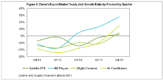 據(jù)IHS iSuppli公司的中國研究報(bào)告,全球經(jīng)濟(jì)增長速度低于預(yù)期將在2012年上半年損及中國消費(fèi)電子出口市場,衛(wèi)星機(jī)頂盒(STB)、藍(lán)光光盤(BD)播放器、數(shù)碼相機(jī)和空調(diào)銷售將全面下滑。