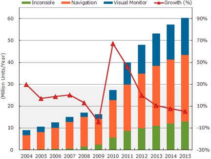 據(jù)NPD DisplaySearch– 平板顯示器于車載的應(yīng)用已經(jīng)越來(lái)越盛行,如汽車導(dǎo)航、多功能駕駛儀表盤、以及后座娛樂顯示屏幕等。NPD DisplaySearch預(yù)測(cè)應(yīng)用于車載的面板出貨量將有望從2011年的4千2百萬(wàn)片成長(zhǎng)到2015年的6千2百萬(wàn)片。