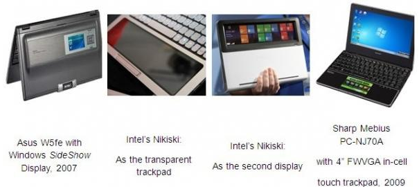 除了將觸控導(dǎo)入于筆記本電腦屏幕外,從過(guò)去到現(xiàn)在也一直有新的創(chuàng)意想法在開(kāi)發(fā)、進(jìn)行中。過(guò)去當(dāng)Windows Vista問(wèn)世時(shí),SideShow的功能讓筆記本電腦多了一個(gè)小屏幕(如Asus W5fe)。雖然當(dāng)時(shí)并不是觸控屏幕而是采實(shí)體按鍵,但對(duì)于一些簡(jiǎn)單的操作目的(像是信件、日程、音樂(lè)播放等),用戶(hù)就不需要打開(kāi)筆記本電腦、而直接于這個(gè)小屏幕操作。后來(lái)的創(chuàng)意還有像是:SHARP將In-Cell內(nèi)嵌式觸控面板導(dǎo)入筆記本電腦的觸摸板,以及Intel于2012年CES展中所揭示的Nikiski概念。Nikiski在正常鍵盤(pán)輸入時(shí)可充當(dāng)觸摸板,合起來(lái)時(shí)又如同SideShow的附加屏幕,不過(guò)卻可以觸控支持Metro接口的使用。受限于當(dāng)時(shí)時(shí)空環(huán)境里消費(fèi)者使用情境、相關(guān)技術(shù)、成本等因素的成熟度與配合,這些創(chuàng)意或其衍伸當(dāng)時(shí)并未真正導(dǎo)入市場(chǎng),不過(guò)這并不代表這些創(chuàng)意未來(lái)就沒(méi)有面市的可能性。