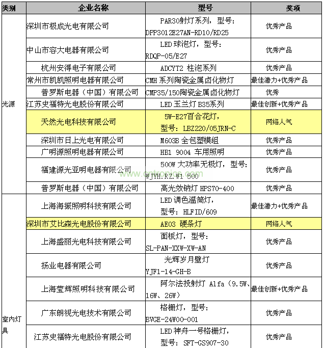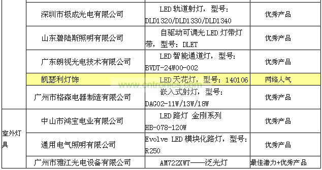 2012年6月9日,2012廣州國(guó)際照明展覽會(huì)開(kāi)幕當(dāng)天,主辦方組織20名終審專(zhuān)家對(duì)終審會(huì)議評(píng)選出來(lái)的獲獎(jiǎng)候選產(chǎn)品進(jìn)行現(xiàn)場(chǎng)的考核評(píng)審,最終確定35個(gè)優(yōu)秀產(chǎn)品獎(jiǎng),3個(gè)最佳創(chuàng)新獎(jiǎng)、5個(gè)最佳潛力獎(jiǎng)的獲獎(jiǎng)名單;5個(gè)最佳網(wǎng)絡(luò)人氣獎(jiǎng)是由網(wǎng)友海選出來(lái)的名單。