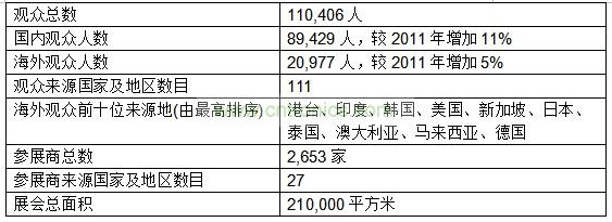 第十七屆「廣州國際照明展覽會」展覽面積達21萬平方米,規(guī)模較2011年增長5%,參展企業(yè)2653家,比上屆減少9%,參展企業(yè)來自全球27個國家和地區(qū)。本屆展會觀眾數(shù)目同創(chuàng)新高,吸引了110,406名觀眾,較2011年增長10%,分別來自111個國家及地區(qū),其中國內(nèi)專業(yè)觀眾89,429人,較2011年增加11%,海外專業(yè)觀眾20,977人,較2011年增加5%,海外觀眾前十位來源地分別是港澳臺地區(qū)、印度、韓國、美國、新加坡、日本、泰國、澳大利亞、馬來西亞和德國。大會同期舉辦的各類技術(shù)研討會、產(chǎn)業(yè)高峰論壇、產(chǎn)品推介會、交易節(jié)等高水平會議、論壇交流活動多達110多場次,較去年增加10場,亦創(chuàng)新高。