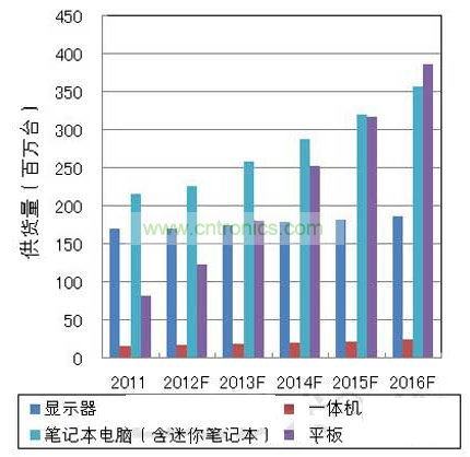 未來的市場動向方面,筆記本電腦市場的年增長率有望達到10~15%左右,平板電腦市場將憑借低價格和輕便、應用程序與智能手機的通用性,繼續(xù)保持大約30~40%的增長率,到2016年,平板電腦的供貨量預計將超過筆記本電腦(圖1)。