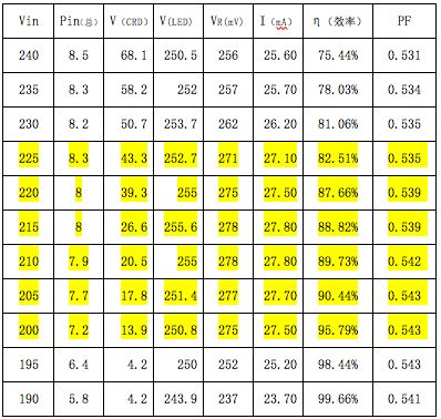 下面舉一個(gè)實(shí)測(cè)的結(jié)果為例,這是一個(gè)80顆3014串聯(lián)的球泡燈,采用了5顆Semitek 的S-562T并聯(lián)。它在不同的輸入市電電壓時(shí),所測(cè)得的結(jié)果如下表所示。