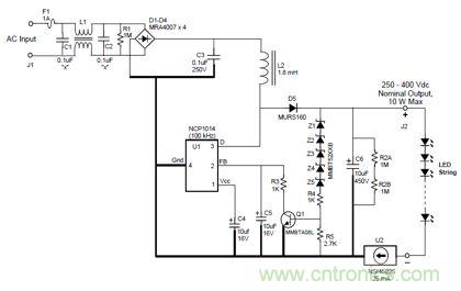美國(guó)安森美公司加了一個(gè)功率因素校正芯片NCP1014的恒流二極管的電源,其電原理圖見(jiàn)圖12。