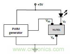 采用PWM信號(hào)調(diào)光以后可以避免由于改變電流而引起的光譜偏移。但是不能采用只有兩條管腳的恒流二極管,而必須采用帶有控制開(kāi)斷管腳的至少3條管腳的恒流二極管。
