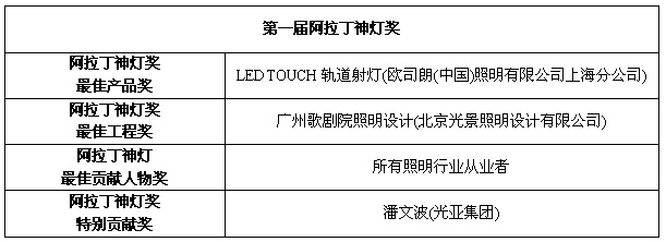 9日,在廣州國際照明展覽會(huì)開幕式晚宴上,同時(shí)舉行了“阿拉丁神燈獎(jiǎng)”大型頒獎(jiǎng)盛典,現(xiàn)場宣布了評選的最終賽果,并頒發(fā)了相關(guān)的獎(jiǎng)項(xiàng)。第一屆“阿拉丁神燈獎(jiǎng)”結(jié)果昨晚隆重揭曉,其中奪得“阿拉丁神燈獎(jiǎng)最佳產(chǎn)品獎(jiǎng)”為:歐司朗(中國)照明有限公司上海分公司的LEDTOUCH 軌道射燈;奪得“阿拉丁神燈獎(jiǎng)最佳工程獎(jiǎng)”為:北京光景照明設(shè)計(jì)有限公司的廣州歌劇院照明設(shè)計(jì)。本屆“阿拉丁神燈獎(jiǎng)最佳貢獻(xiàn)人物獎(jiǎng)”頒發(fā)予所有照明行業(yè)從業(yè)者。另頒發(fā)“特別貢獻(xiàn)獎(jiǎng)”,由光亞集團(tuán)董事長潘文波博士獲得。