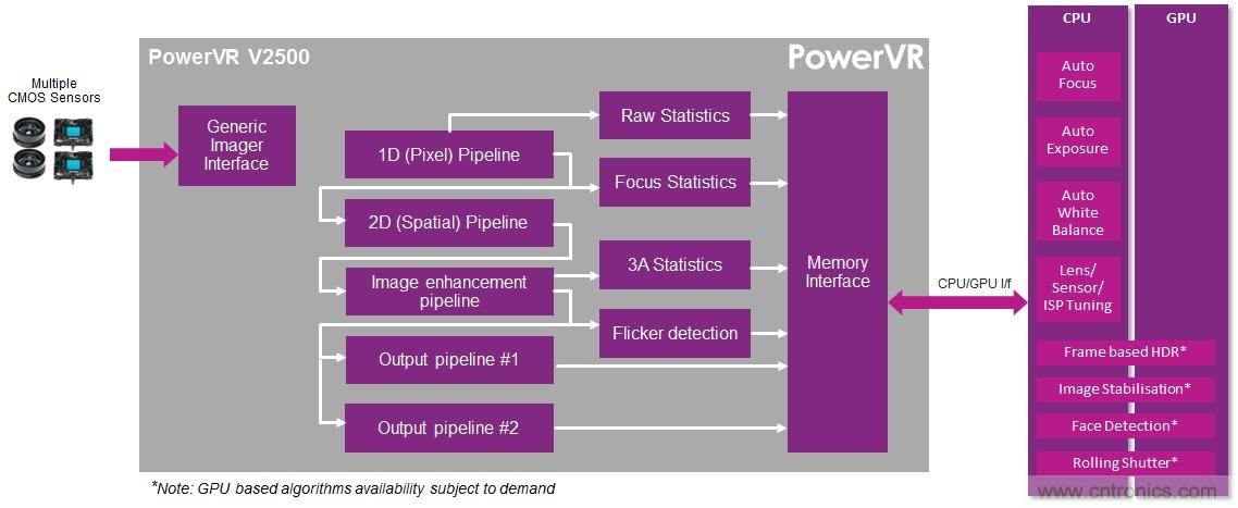 V2500 能與任何一款視頻編碼器配合使用,它經(jīng)過特別的最優(yōu)化設計,可與 Imagination 的 PowerVR Series5 和之前世代的視頻編碼器完美整合,形成一個專用的編碼器處理路徑、直接零內存輸出至編碼器,并能輸出圖像統(tǒng)計與元數(shù)據(jù)(metadata),以實現(xiàn)同類最佳的編碼品質與即時位元率控制。因此,它能提供更低功耗、更小帶寬、更短延遲與更高性能等優(yōu)勢——最終能在既定的比特率下提供優(yōu)異的圖像品質。