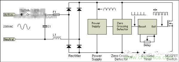 后沿切相調(diào)光器一般包括過(guò)零檢測(cè)電路,計(jì)時(shí)器及MOSEFT開(kāi)關(guān)。