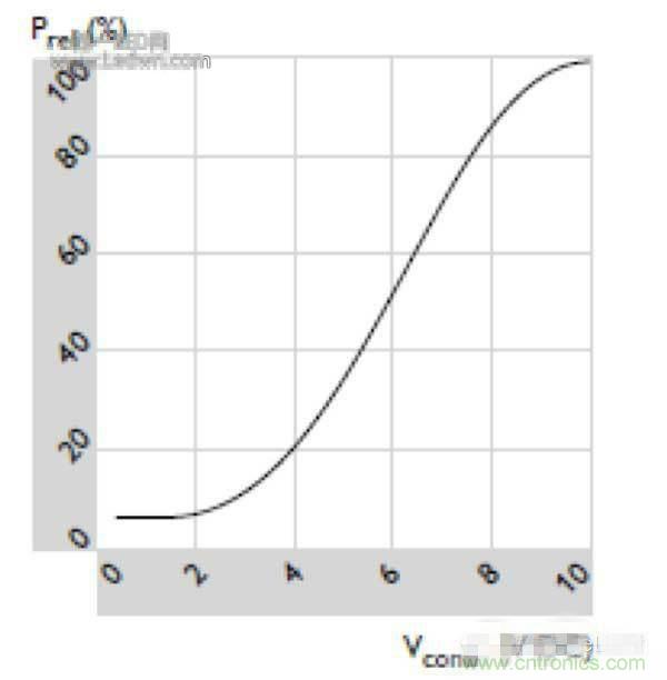 6)調(diào)光范圍0.1%-100%,最低限值取決于供應(yīng)商,調(diào)光曲線標(biāo)準(zhǔn)化且適應(yīng)人眼的敏感度(下圖:對(duì)數(shù)調(diào)光曲線);