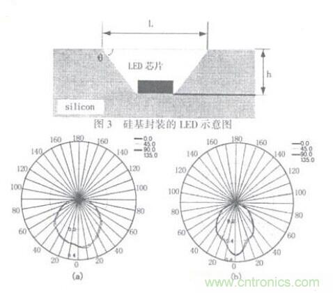 MEMS技術(shù)是隨著半導(dǎo)體和微電子技術(shù)的發(fā)展麗發(fā)展起來的一項新興的細(xì)微加工技術(shù),加工尺寸從毫米到微米數(shù)量級,甚至亞微米的微小尺寸:其加T藝主要分為表面工藝和體工藝?;诠杌捏w工藝又稱為體硅工藝,體硅工藝呵以在硅基體上形成高深寬比的凹稽。由于MEMS的加工尺寸很小,因此利用該技術(shù)形成的微小凹槽作為LED芯片封裝的反射腔(如圖3),將會克服目前LED芯片直接封裝在PCB板上而引起發(fā)光效率低的問題;同時由于硅具有良好的導(dǎo)熱特性,因此可以降低目前封裝中熱阻高的問題,從而提高LED芯片的發(fā)光效率和可靠性。圖4(a)和(b)給出了當(dāng)LED芯片直接貼裝在PCB板上和貼裝在有凹槽的硅基上的發(fā)光特性。從圈中可以看出,LED貼裝在帶有凹槽的硅基上以后其發(fā)出光的發(fā)散性能得到了很大的改善,LED的發(fā)光強(qiáng)度提高了75%以上。