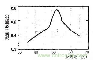 圖5為LED發(fā)射光與反射的反射角θ之間的關(guān)系,從圖中可看出當(dāng)反射角為52度的時候反射光強(qiáng)取得最大。從理論上講,硅凹槽反射角應(yīng)該設(shè)計為52度。但是,考慮到對(100)硅進(jìn)行腐蝕的時候,其(111)面和(100)面會自動形成一個54.7度的角,而通過仿真分析結(jié)果可以計算。當(dāng)反射角為54.7度的時候。LED的反射光強(qiáng)只比反射角為52度的時候小12%,而且光強(qiáng)分布也比較接近。因此在腐蝕凹槽的時候可以直接采用硅的(100)面和(111)面形成角度作為反射角,這可以極大的簡化加工工藝,降低制造成本,而且對LED光強(qiáng)的影響也不是很大。