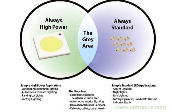 體積較小、通過電池供電或便攜式的設(shè)備(例如消費(fèi)類電子產(chǎn)品、重點(diǎn)照明和標(biāo)準(zhǔn)指示燈等),已經(jīng)在很長一段時間內(nèi)使用了標(biāo)準(zhǔn)LED,而且有可能繼續(xù)使用。同樣,一些領(lǐng)域?qū)^續(xù)使用大功率LED技術(shù),包括:一般戶外照明、大面積的室內(nèi)照明(軌道燈、燈泡替換物)以及汽車前照燈等。