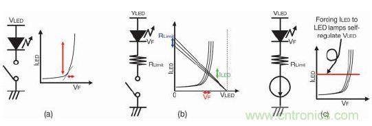 現(xiàn)在我們來看看圖1b。添加一個(gè)限流電阻器RLIMIT來保護(hù)LED燈。由于有限流電阻器,因此該燈不會(huì)被燒壞。在視頻顯示器應(yīng)用領(lǐng)域,這種方法在控制LED光強(qiáng)度方面仍然不夠好。LED曲線和RLIMIT產(chǎn)生的負(fù)載曲線可決定其LED電流值。如紅色或藍(lán)色標(biāo)記所示,該LED和電阻器分別存在制造誤差造成的正向電壓變化及電阻變化。這些誤差因素會(huì)使LED電流(綠)產(chǎn)生不可忽視的變化。