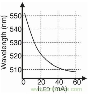 這時(shí)候,需要考慮電流變化對(duì)LED光輸出波長(zhǎng)值的影響。改變波長(zhǎng)就意味著改變?nèi)搜劭吹降纳?。圖4是綠色LED燈的實(shí)例。通常在業(yè)界,510nm 廣泛代表綠色。因此,大部分LED燈制造商所設(shè)計(jì)的LED燈產(chǎn)品在最大額定電流下都具備510nm的波長(zhǎng)。在圖4中,隨著LED電流的升高,波長(zhǎng)可達(dá)到510nm。獲得綠色的最佳方法是盡量使燈的驅(qū)動(dòng)電流接近最大額定值。這也就說明了為什么使用數(shù)字控制比使用模擬控制好。