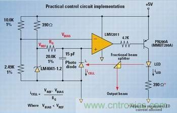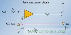 【導讀】在利用光來控制應用的過程中,要長期保持原始設定的發(fā)光強度需要一個控制電路來監(jiān)控發(fā)光狀況,并控制供給光發(fā)射器件的電流以保持輸出恒定。而采用一個簡單的運算放大器電路就做到,即便發(fā)光器件老化,通過調(diào)整LED電流,一個控制環(huán)也可維持恒定的光強度。