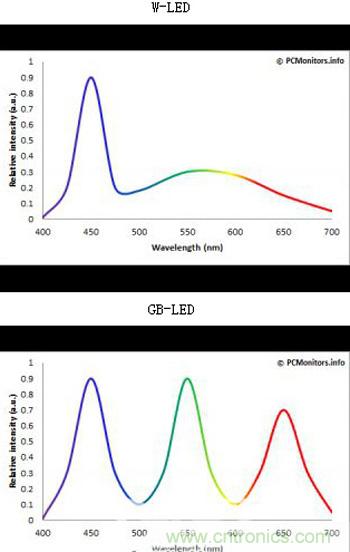 不管是投影儀還是電視機都采用的是RGB-LED光源,也就是紅黃藍(lán)三色LED光源,而這3種顏色的LED,以“藍(lán)光LED”最為重要,減弱藍(lán)光則會使色彩失真,整體畫面色調(diào)偏紅黃。一起看看LED顯示器兩種主要發(fā)光模塊W-LED(常用)和GB-LED的光譜組成。如下圖: