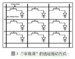 而第三種“半有源”驅(qū)動(dòng)雖然可以較好地避免像素之間的串?dāng)_現(xiàn)象,但是由于其像素電路中沒有存儲(chǔ)電容,并且每一列的驅(qū)動(dòng)電流信號(hào)需要單獨(dú)調(diào)制,并不能完全達(dá)到上面列出的有源選址驅(qū)動(dòng)方式的全部優(yōu)勢(shì)。