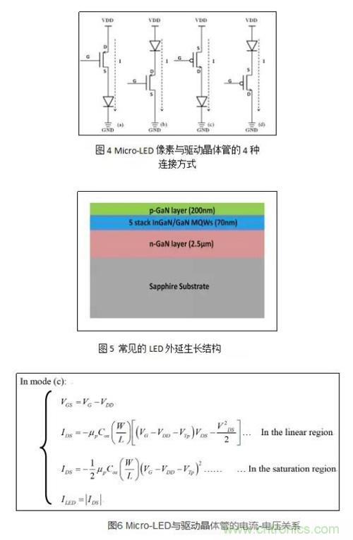 圖4(a)中Micro-LED像素連接在N型驅(qū)動(dòng)晶體管的源極(Source)。由外延生長(Epitaxial Growth)、制備工藝、及器件老化所產(chǎn)生的不均勻性所導(dǎo)致的Micro-LED電學(xué)特性的不均勻性將會(huì)直接影響驅(qū)動(dòng)晶體管的VGS,從而造成顯示圖像的不均勻。而圖4(c)中的Micro-LED像素連接在P型驅(qū)動(dòng)晶體管的漏極(Drain),可以避免上述影響,其電流-電壓關(guān)系圖6所示。因此,有P管像素電路驅(qū)動(dòng)Micro-LED較為適宜。