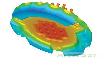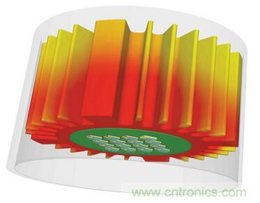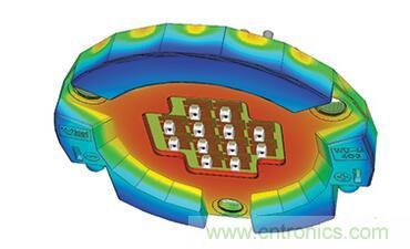 LED燈具設(shè)計師所面臨的挑戰(zhàn)是如何將所有這些東西都放在可用的空間中,同時確保成品內(nèi)部和外部關(guān)鍵點的溫度保持在可接受的范圍內(nèi)。這時候,熱模擬就能起到作用,特別是在整個設(shè)計過程中。圖2示出了在熱模擬下有良好散熱的芯片模塊范例。