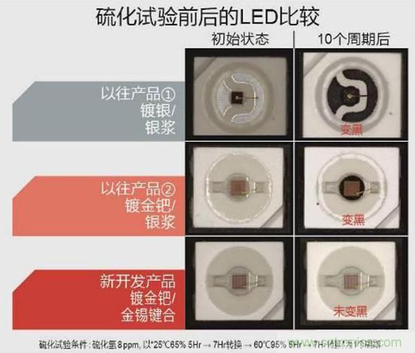 在硫化試驗(yàn)中,以往使用鍍銀框架及銀漿的產(chǎn)品的光通量在一個(gè)周期(24小時(shí))后為70%,10個(gè)周期后為60%,時(shí)間越長(zhǎng)其光通量越低;而新產(chǎn)品可在10個(gè)循環(huán)(240小時(shí))后依然保持幾乎100%的高光通量 。