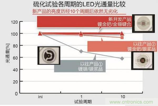 通過(guò)對(duì)比得出ROHM新產(chǎn)品的優(yōu)勢(shì):一是能保持亮度,二保護(hù)芯片鍵合材料不受損壞,三無(wú)需其他保護(hù)對(duì)策。