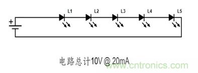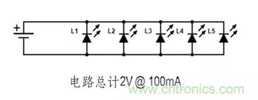 【導(dǎo)讀】LED電路的接線方式?jīng)Q定了電路正常工作所需的電壓和電流。下方兩條電路使用了五個(gè)160-1445-1-ND LED。單個(gè)LED電壓2V 20mA。如您所見, 每條電路所需的工作電壓和電流之間存在顯著差異。