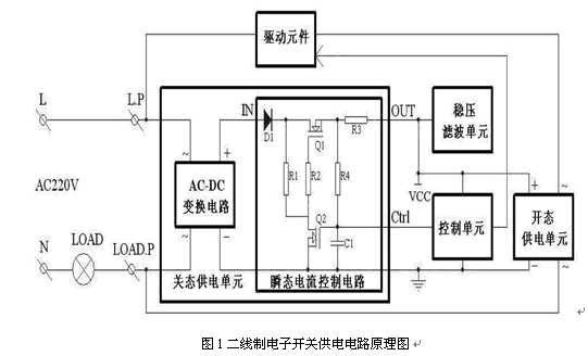 基于以上問(wèn)題,本文提供了一種用于二線制電子開(kāi)關(guān)的供電電路,在開(kāi)關(guān)關(guān)閉時(shí)給控制電路提供很小的電流,用以維持待機(jī)工作,開(kāi)關(guān)開(kāi)啟的瞬間,先由控制單元控制關(guān)態(tài)供電單元,提供較大的工作電流給控制單元和驅(qū)動(dòng)元件,使開(kāi)關(guān)開(kāi)啟,然后轉(zhuǎn)入開(kāi)態(tài)供電狀態(tài)。當(dāng)開(kāi)關(guān)關(guān)閉時(shí),控制單元控制關(guān)態(tài)供電單元提前進(jìn)入大電流工作狀態(tài),迅速補(bǔ)充開(kāi)關(guān)關(guān)閉瞬間控制單元和驅(qū)動(dòng)元件消耗的功率,使電源濾波電容兩端的電壓維持在額定值。有效地解決了負(fù)載燈具閃爍的問(wèn)題。