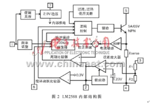 LM2588采用7腳TO-220封裝,主要包括100kHz振蕩器、2.9V穩(wěn)壓電路、誤差放大器、5A/65V的NPN開關(guān)管以及過流、過熱、低電壓鎖定,還包括軟啟動、邏輯關(guān)斷、邏輯控制等,內(nèi)部結(jié)構(gòu)如圖2所示。
