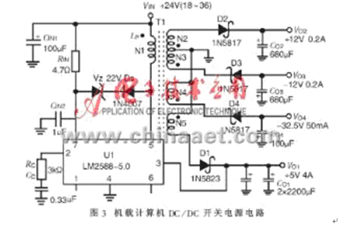 U1為控制器LM2588-5.0。脈沖變壓器T1共有五個繞組:N1為初級繞組,N2、N3、N4、N5為次級繞組,分別對應(yīng)輸出+12V@0.2A、-12V@0.2A、-32.5V@0.05A以及+5V@4A,且N2、N3圈數(shù)相同。
