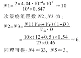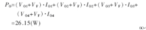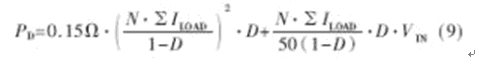 損耗功率PD主要取決于VI、多路輸出最大負(fù)載電流之和ΣILOAD以及主功率線圈比N等,其近似計算公式如下: