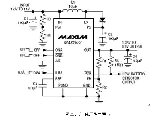設(shè)計者也可以直接用一組Buck/Boost電源IC產(chǎn)生所需要的電壓輸出, 圖二便是一組直接升/降壓轉(zhuǎn)換IC。它結(jié)合了一組升壓轉(zhuǎn)換器和線性穩(wěn)壓器,提供既可以升壓,也可以降壓的轉(zhuǎn)換方案。這個轉(zhuǎn)換器在輸入電壓高于或低于輸出電壓時能夠提供一個穩(wěn)定的輸出,允許輸入范圍:1.8V至11V,可預(yù)置為3.3V或5V輸出,也可以使用兩個分壓電阻得到可調(diào)節(jié)的輸出電壓:1.25V至5.5V,效率可達(dá)85%。如果需要3.5V至4V之間的輸出,可以用升壓轉(zhuǎn)換器與線性穩(wěn)壓器相組合的方式實現(xiàn)。如:MAX1606升壓轉(zhuǎn)換器與MAX8512線性穩(wěn)壓器的組合。
