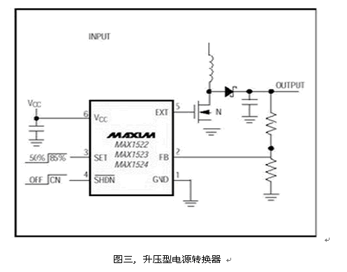 有些設(shè)計者為了追求較高的轉(zhuǎn)換效率, 選擇了升壓方式,產(chǎn)生一組高于輸入的穩(wěn)定輸出, 如圖三的升壓架構(gòu)。由于功率開關(guān)MOSFET是外置的, 可提供較大的輸出功率。在輸出功率許可的條件下,也可以選擇內(nèi)置MOSFET功率開關(guān)的升壓轉(zhuǎn)換器,如MAX1722, 可有效節(jié)省空間、降低成本。