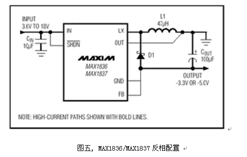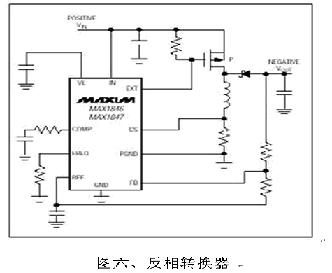 也可以選擇負(fù)電壓輸出轉(zhuǎn)換器, 圖六便是常用的PWM負(fù)壓轉(zhuǎn)換器, 外部元件少、設(shè)計簡易, 工作在固定頻率的PWM結(jié)構(gòu)干擾較小。