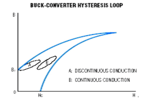 磁芯損耗主要是由于磁滯現(xiàn)象以及磁芯內(nèi)部傳導(dǎo)率或其他非線性參數(shù)的互感產(chǎn)生。在Buck拓?fù)浣Y(jié)構(gòu)中,第一象限的B-H磁滯回線對(duì)磁芯損耗影響最大。在第一象限這個(gè)局部圖中,磁滯回線顯示了電感從初始電感量過渡到峰值電感量再回到初始電感量的過程。如果開關(guān)電源穩(wěn)定工作在不連續(xù)狀態(tài),磁滯回線會(huì)從剩余電感量(Br)過渡到峰值電感量(參考圖1)。如果開關(guān)電源工作在連續(xù)狀態(tài),那么磁滯回線將會(huì)從直流偏置點(diǎn)上升到曲線峰值,再回到直流偏置點(diǎn)。通過實(shí)驗(yàn)可以確定磁滯回線的精確曲線形狀(基本上是橢圓曲線)。