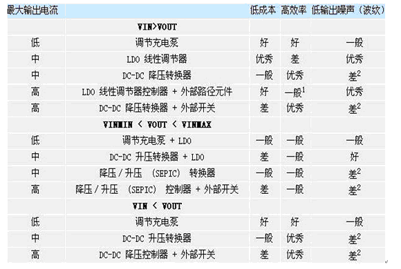 針對應用而選擇最佳的分立 DC/DC 轉換器成為了成本、效率、以及輸出噪聲或波紋之間的一種權衡。表1根據(jù)4個因素對比了各種轉換器:最高輸出電流、效率、輸出波紋/噪聲及總成本。