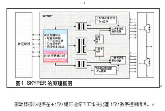 圖1是SKYPER驅(qū)動(dòng)電路的原理框圖。該電路是一個(gè)半橋電路,它具備基本驅(qū)動(dòng)電路所有的功能,如電勢(shì)隔離,保護(hù)功能如VCE監(jiān)測(cè),短脈沖抑制,欠壓監(jiān)測(cè)以及死區(qū)時(shí)間。通過(guò)使用ASIC芯片以及基于基本驅(qū)動(dòng)器功能的驅(qū)動(dòng)器設(shè)計(jì),它需要的元器件比傳統(tǒng)的驅(qū)動(dòng)電路要少得多。