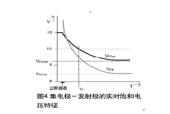 使用信號(hào)變壓器(脈沖變壓器)不僅可以提供高質(zhì)量的電氣隔離,它在原邊與副邊間還有很高的dv/dt(50kv/us)。與光耦構(gòu)成的驅(qū)動(dòng)電路不一樣的是,信號(hào)變壓器可靠性好,號(hào)電路通道被互鎖,直到有復(fù)位脈沖對(duì)該電路進(jìn)行復(fù)位。在IGBT退飽和監(jiān)視中,必須考慮它的實(shí)時(shí)飽和電壓特征。在IGBT開(kāi)通的最初幾個(gè)微秒,集電極-發(fā)射極電壓遠(yuǎn)高于穩(wěn)定后的VCEsat值。因此監(jiān)測(cè)電路的響應(yīng)特征在消隱時(shí)間內(nèi)(圖4)必須與VCEsat特征圖一致。