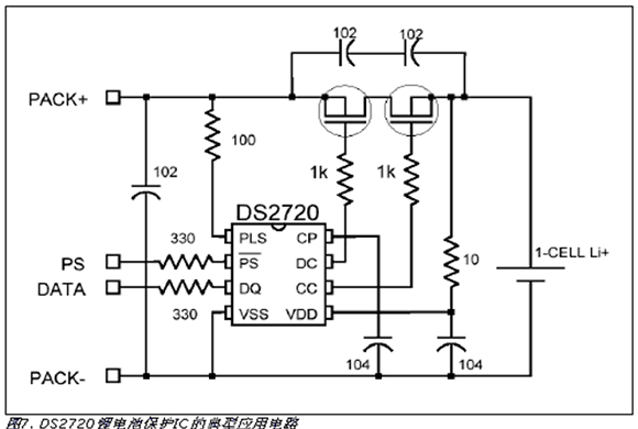 因?yàn)長i+電池過充或過放可能會(huì)導(dǎo)致爆炸并造成人員傷害,所以使用這類電池時(shí),安全是主要關(guān)心的問題。因此,商用鋰離子電池組通常包括象DS2720這樣的保護(hù)電路(圖7)。