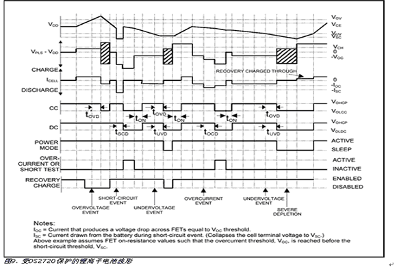 a 過壓 如果在VDD檢測的電池電壓超過過壓閾值VOV時(shí)間大于過壓延遲時(shí)間tOVD,則DS2720關(guān)閉充電FET,并將保護(hù)寄存器的OV置位。在過壓期間,放電通路保持開放。除非被另外保護(hù)條件鎖定,當(dāng)電池電壓降到充電使能閾值VCE以下或由于放電導(dǎo)致VDD-VPLS>VOC時(shí),充電FET被重新使能。