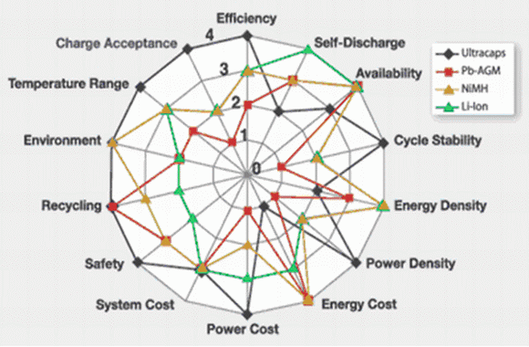 Li離子、NiMH等新型電池可以提供一個可靠的能量儲存方案,并且已經(jīng)在很多領(lǐng)域中廣泛使用。眾所周知,化學電池是通過電化學反應,產(chǎn)生法拉第電荷轉(zhuǎn)移來儲存電荷的,使用壽命較短,并且受溫度影響較大,這也同樣是采用鉛酸電池(蓄電池)的設(shè)計者所面臨的困難。同時,大電流會直接影響這些電池的壽命,因此,對于要求長壽命、高可靠性的某些應用,這些基于化學反應的電池就顯出種種不足。